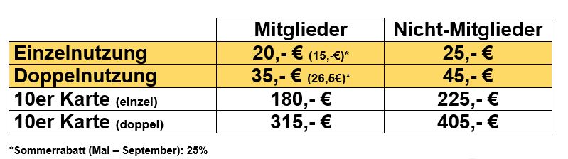Preisliste für Kabinennutzung (Raum steht 60 Minuten zur Verfügung, inkl. Dusche, Handtücher und Getränk):